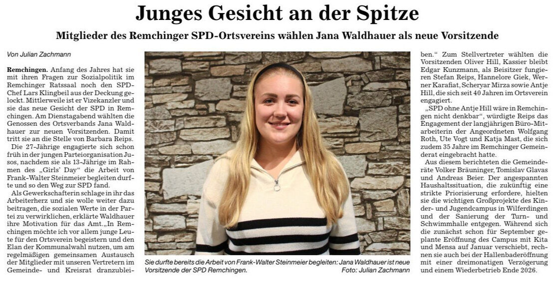 Wir hatten im Oktober 2025 unsere Mitgliederversammlung & haben unseren neuen Vorstand gewählt. Wir bedanken uns ganz herzlich bei Barabara Reips für Ihren Einsatz als Vorsitzende der SPD Remchingen in den letzten Jahren. Wir wünschen unserer neuen Vorsitzenden: Jana Waldhauer alles Gute für ihr neues Amt.